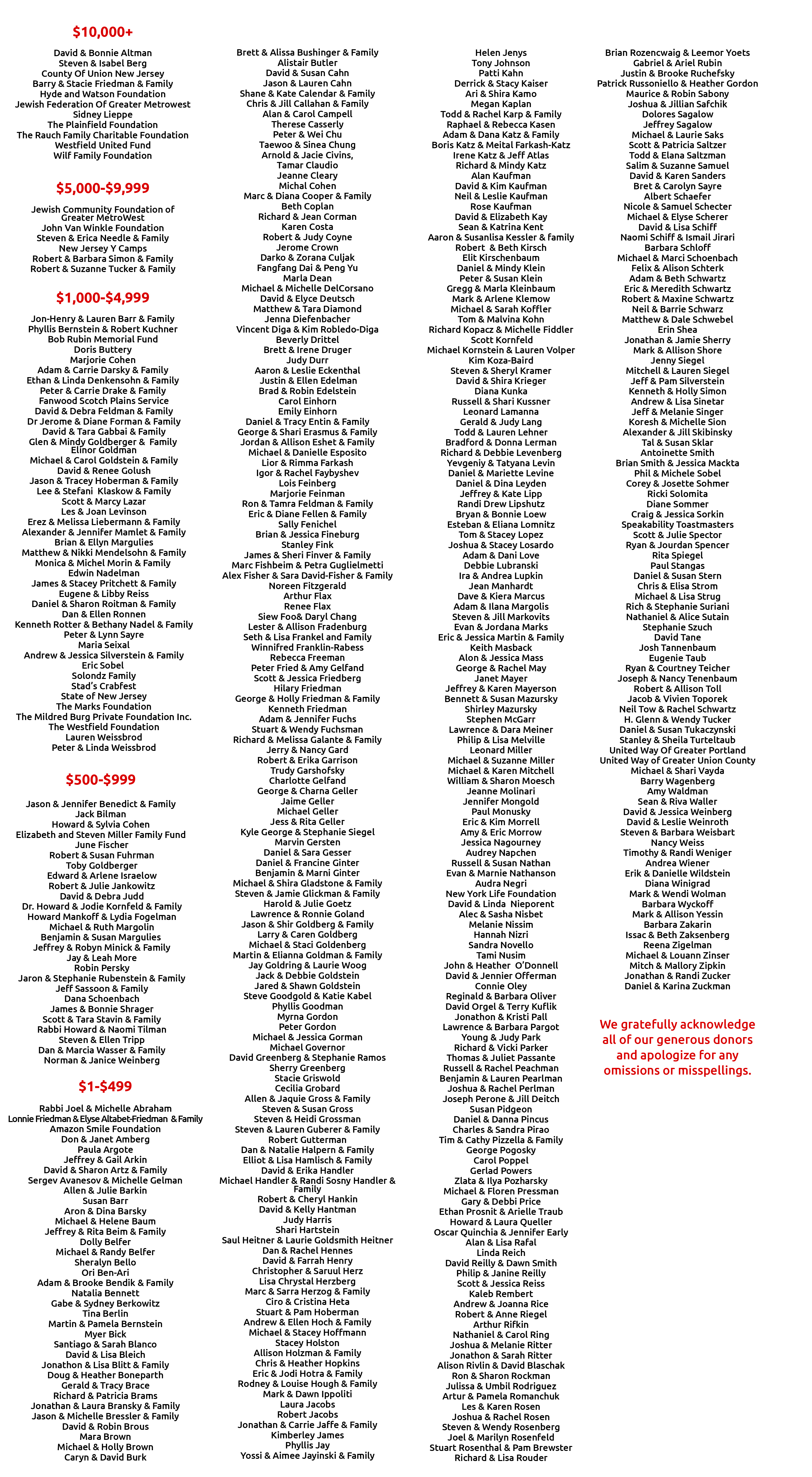 Eleanor & Jeffrey Peris Brian & Pam Shlissel Bonnie & James Shrager Jessica Silverstein Sanford Simon Jill & Alexander Skibinsky Diane Sommer Tara & Scott Stavin Courtney Teicher Suzanne Albin Tucker Robert Tucker Jon Ulanet Marcia & Daniel Wasser Janice & Norman Weinberg Linda Weissbrod Peter Weissbrod |