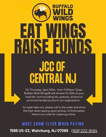 However you Dine to Donate, show the Buffalo Wild Wings flyer when you pay to ensure that a portion of your bill will be donated back to the JCC.